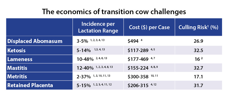 The transition period should be the pinnacle of a dairyman’s focus, because any miscalculation here can cost thousands in either health related issues or long-term production losses. In fact, 70-80% of veterinary costs are incurred 1-3 weeks post-freshening. With proper understanding of the relationship between fresh cow physiology and proper nutrition, a dairy farmer can save significantly on treatment interventions, culling or lost production. The table below, highlights some of the key post-freshening challenges and associated treatment costs.