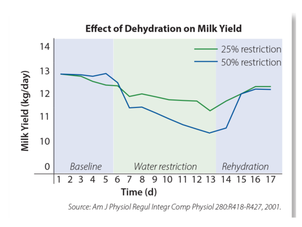 Researchers and producers have long recognized that dairy cows readily consume large volumes of water immediately post-freshening and shortly after milking. Cows crave water at these times due to the large volumes of fluid and water released or expended through freshening and milking. As an example, cows producing 90 pound calves expend or release about an equal volume of 90 pounds of fetal fluid and membranes at freshening. Post-freshening, cows immediately take action or crave to replenish the fluids lost as seen by their desire to consume 5-10 gallons of water in a short period of time. With research showing that restricted water consumption has a negative impact on milk production, adequate hydration immediately post-freshening is one way to support a quicker recovery, and set up the cow for optimized milk production through lactation.