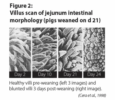 These events can result in digestive upsets, scouring, more fall-behinds, and even mortality for the weak. Nutritional support is required to help pigs overcome the health challenges but getting pigs to eat is an issue – especially when they are either not yet on dry feed or their intake drops so low that minimum nutrient requirements are not being met. Data has shown that no two pigs eat with the same pattern2. In fact, just the opposite is true. A pendulum of consumption that swings between gorging and starving compromises villi in the gut. It takes days, and even weeks, to restore back to health depending on the level of trauma. Sometimes there is no recovery from the stress event and villous atrophy3 (Figure 2) can occur when nutrients are insufficient.