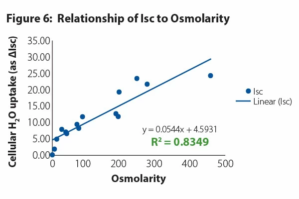 When water and nutrients are transported from the lumen through epithelial cells, electronic charges are generated that occur naturally in a functioning gut. Research experiments mimicking these electronic charges are used to validate the relationship from osmolarity to absorption. Specifically, the strength of Isc (short-circuit) electrical current is measured and the higher the electrical current the more water and nutrients are being transported. Figure 6 shows a direct relationship of higher electrical currents with increased osmolarity.