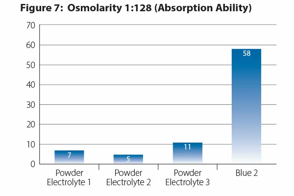 Our framework for product osmolarity is patterned after the World Health Organization’s (WHO) guidelines for human electrolyte products for infants. Simply put, formulating our weaned pig products for optimized osmolarity means that it is easier for nutrients and water to be absorbed into the body’s system. Additionally, baby pig products formulated as a liquid is more than just for ease of use, but also provides a more effective delivery method over powdered electrolyte products when developing for optimal absorptive ability. (Figure 7).