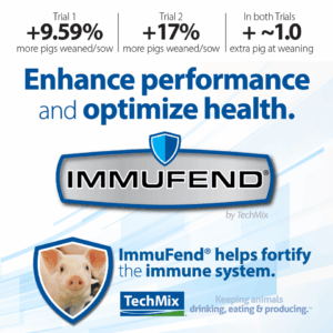 When a pig is sick or stressed, the immune system is impacted which can lead to decreased feed intake, edema, and the reprioritization of essential nutrients away from productive purposes. This results in higher morbidity and mortality in the pigs, not to mention reduced profit for the producer. TechMix has the solution – ImmuFend®. ImmuFend is a specific combination of water-soluble micronutrients that help to fortify the immune system and keep your pigs drinking, eating, and producing.