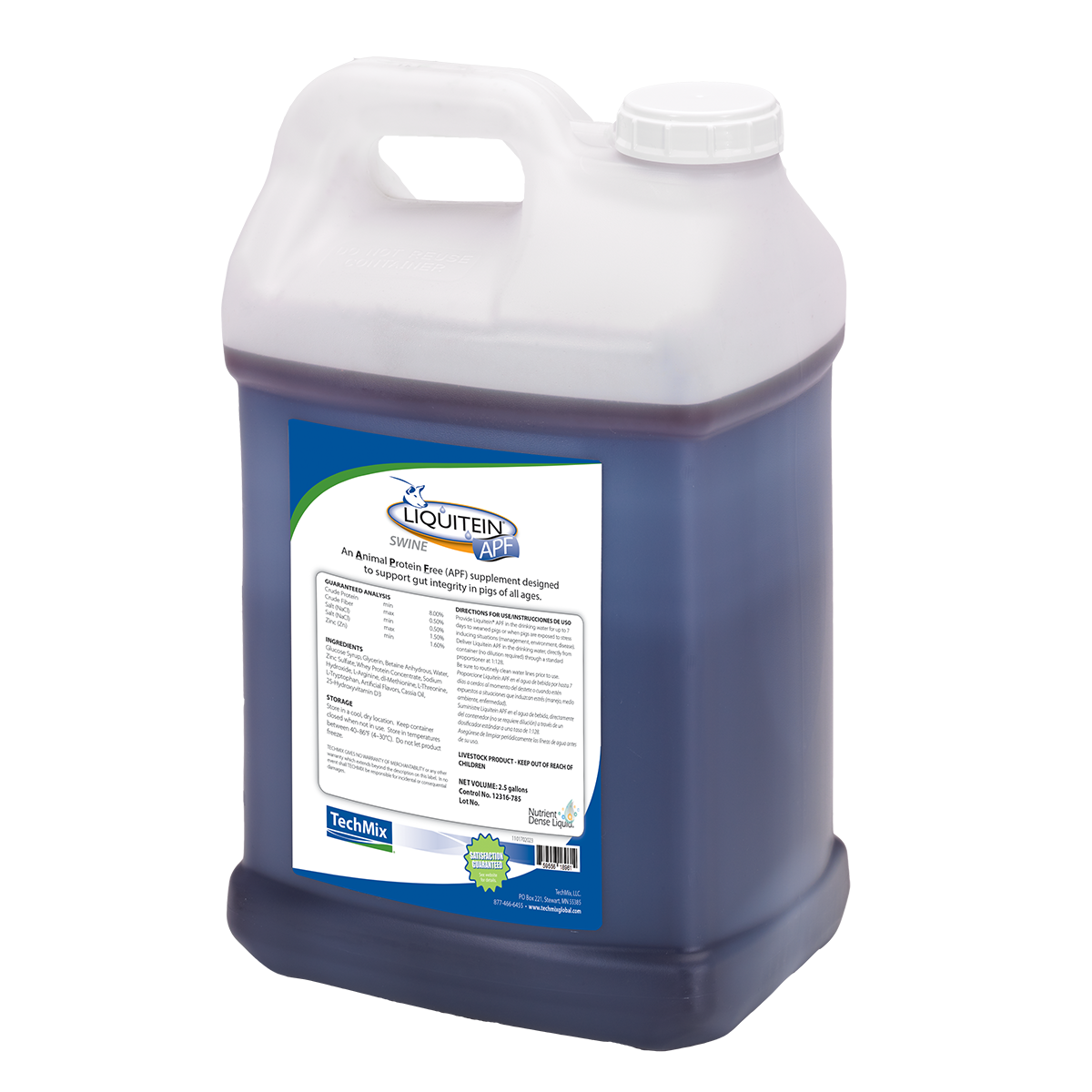 Liquitein®APF is the animal protein free, Nutrient Dense Liquid that helps support the immune system in sick pigs facing enteric challenges. Formulated with zinc and functional amino acids and proteins, Liquitein APF can be used for up to 7 days allowing more time for the key ingredients to help alleviate nutrient disruption, maintain hydration and provide more effective nutrient absorption.