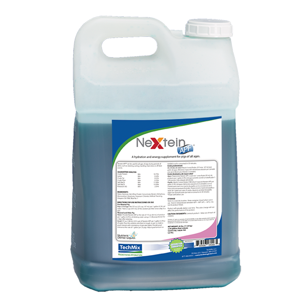 Nextein APF® (Animal Protein Free) is a Nutrient Dense Liquid that contains electrolytes, functional proteins and energy to provide pigs support when they need it most. This product has been formulated for optimal osmolarity for each application use allowing the essential nutrients contained in Nextein APF to be more easily absorbed and quickly utilized.