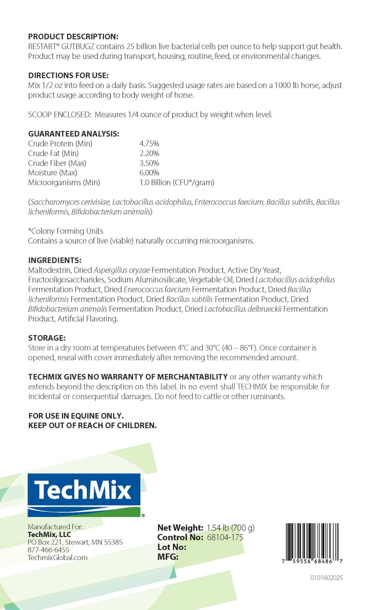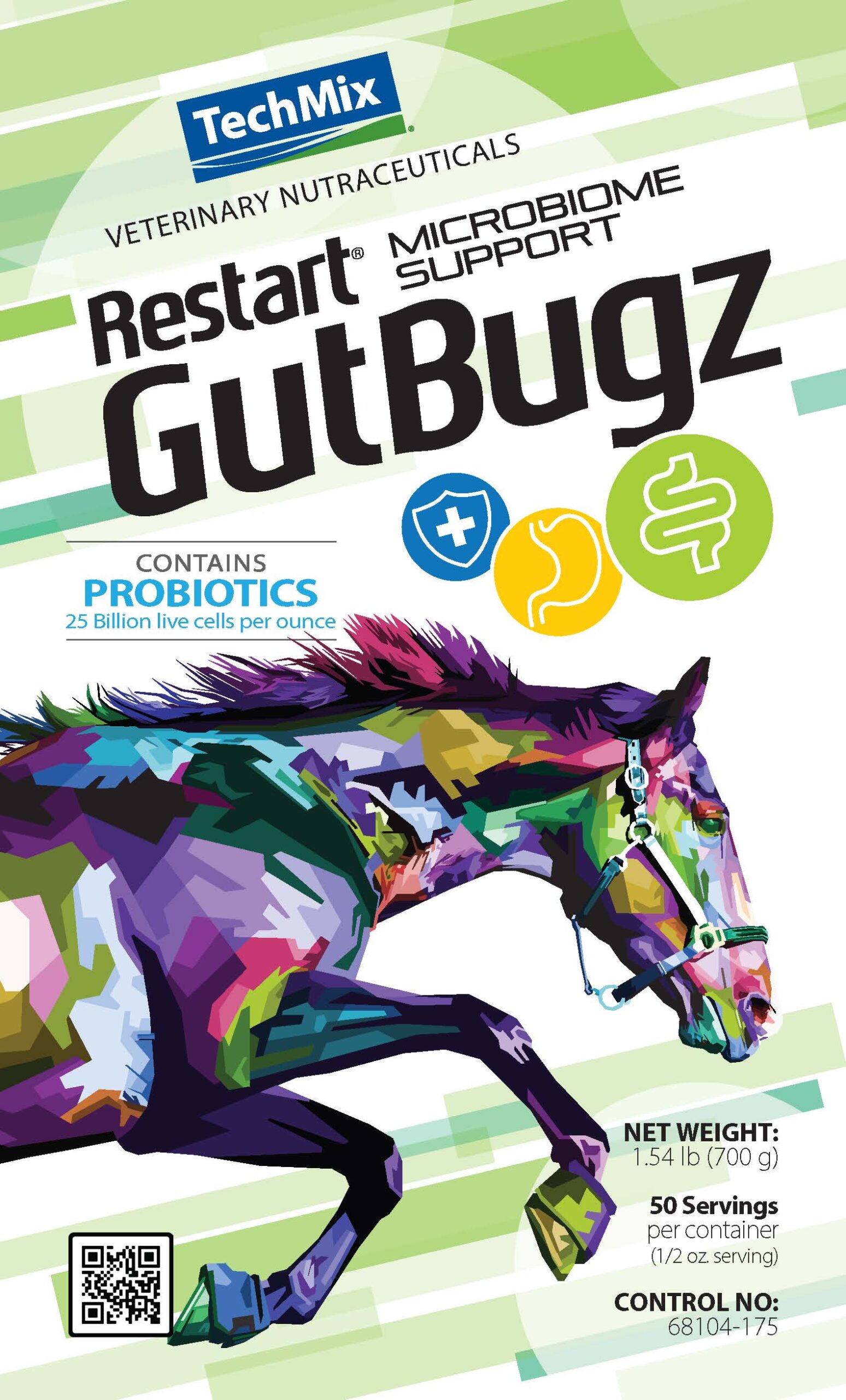 RESTART GUTBUGZ contains 25 billion live bacterial cells per ounce to help support gut health. Product may be used during transport, housing, routine, feed, or environmental changes.